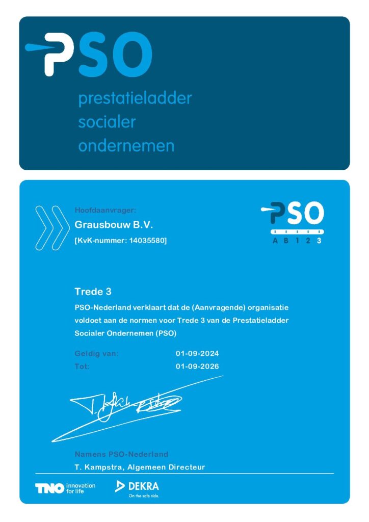 Naast kwaliteit en veiligheid zijn Maatschappelijk Verantwoord Ondernemen, duurzaamheid en het milieu voor GRAUSBOUW heel belangrijke thema’s. Dit dragen we ook graag uit en daarom zijn wij naast de certificaten voor kwaliteit (ISO 9001) en veiligheid (VCA**), ook in het bezit van een tweetal aanvullende certificaten op het gebied van Maatschappelijk Verantwoord Ondernemen, duurzaamheid en milieu. Behalve het PSO certificaat dat is afgegeven door DEKRA, zijn al onze certificaten afgegeven door Normec NCK, het Nederlands Certificatie Kantoor.